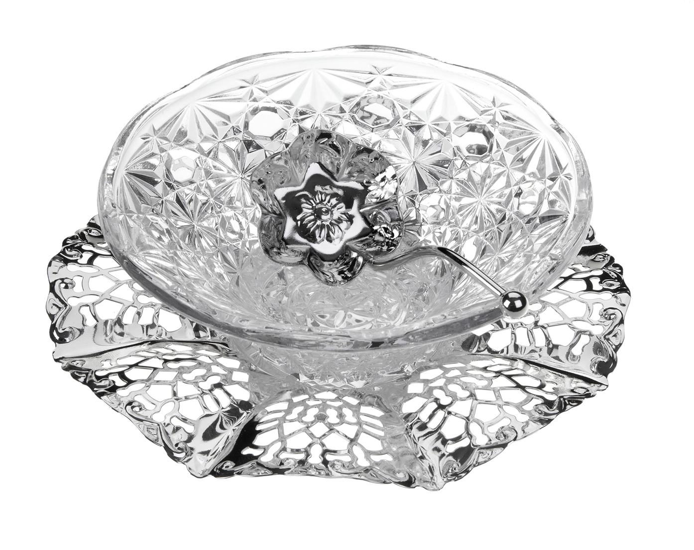 Silver Plated Pierced Wavy Edged Base, with Decorative Tapered Glass Bow and Silver Plated Ornate Serving Spoon.