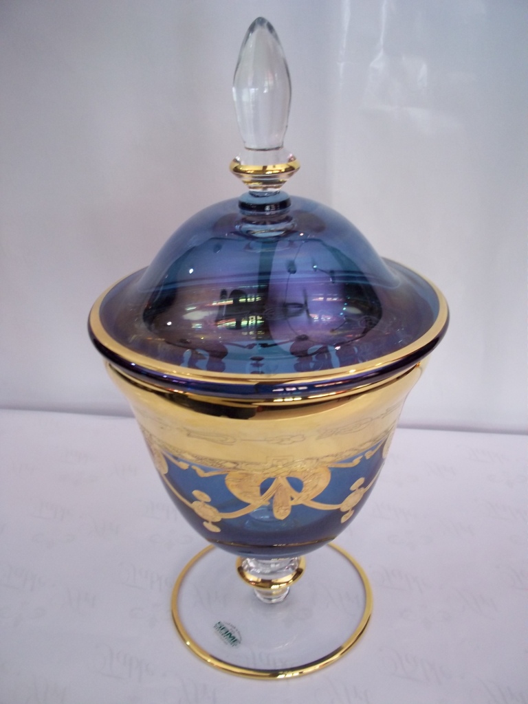 Bonbonniere with lid, Crystal Color Blue With Gold.