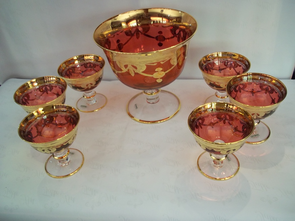 Compote Set 7 Pcs, Crystal, Red Color with gold.