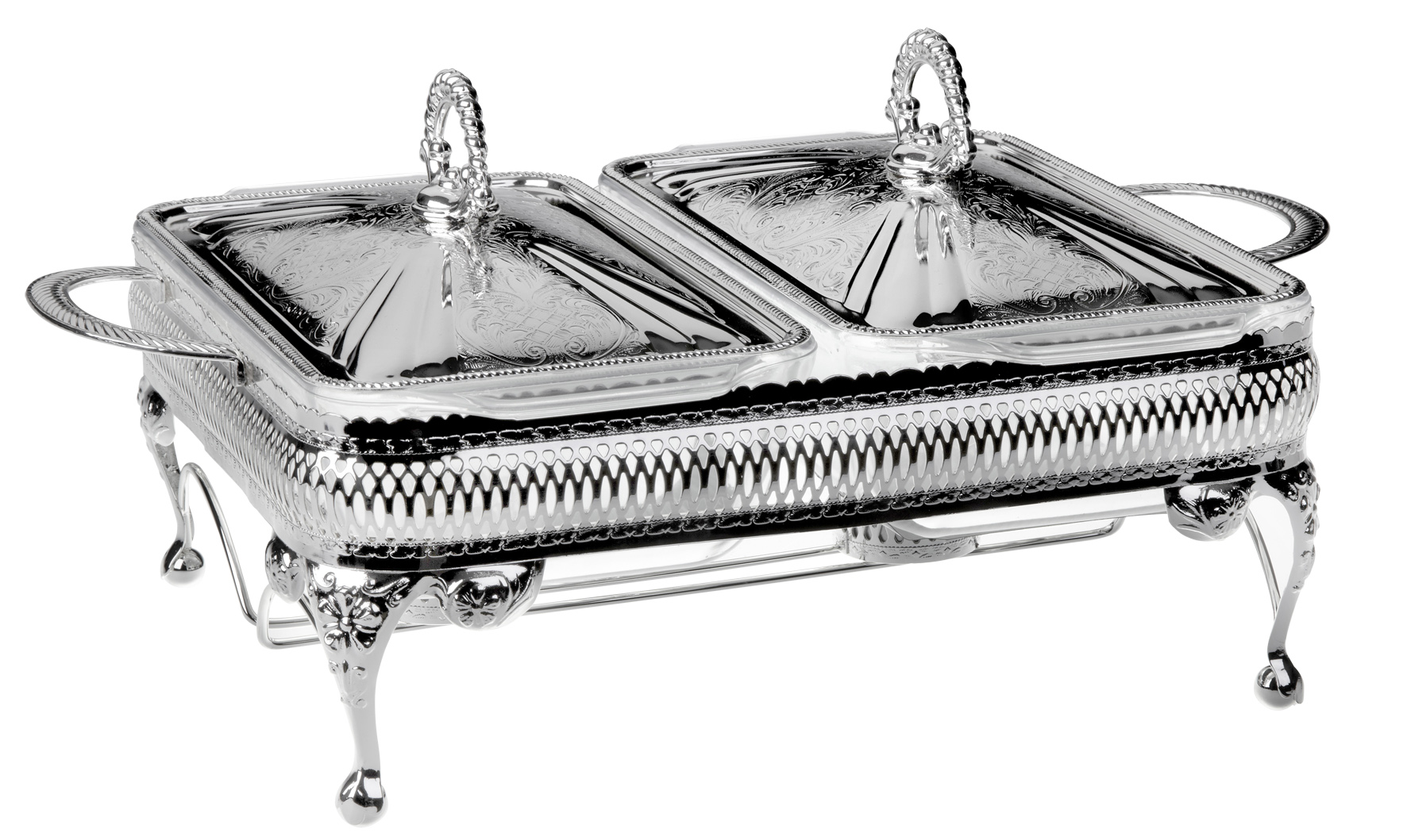 Silver Plated Gallery Frame with Handles, Legs and integral Candle Holders. 2 Oblong “Oven to Tableware” Glass Casseroles, complete with Silver Plated Decorative Lids with Diecast Handles.