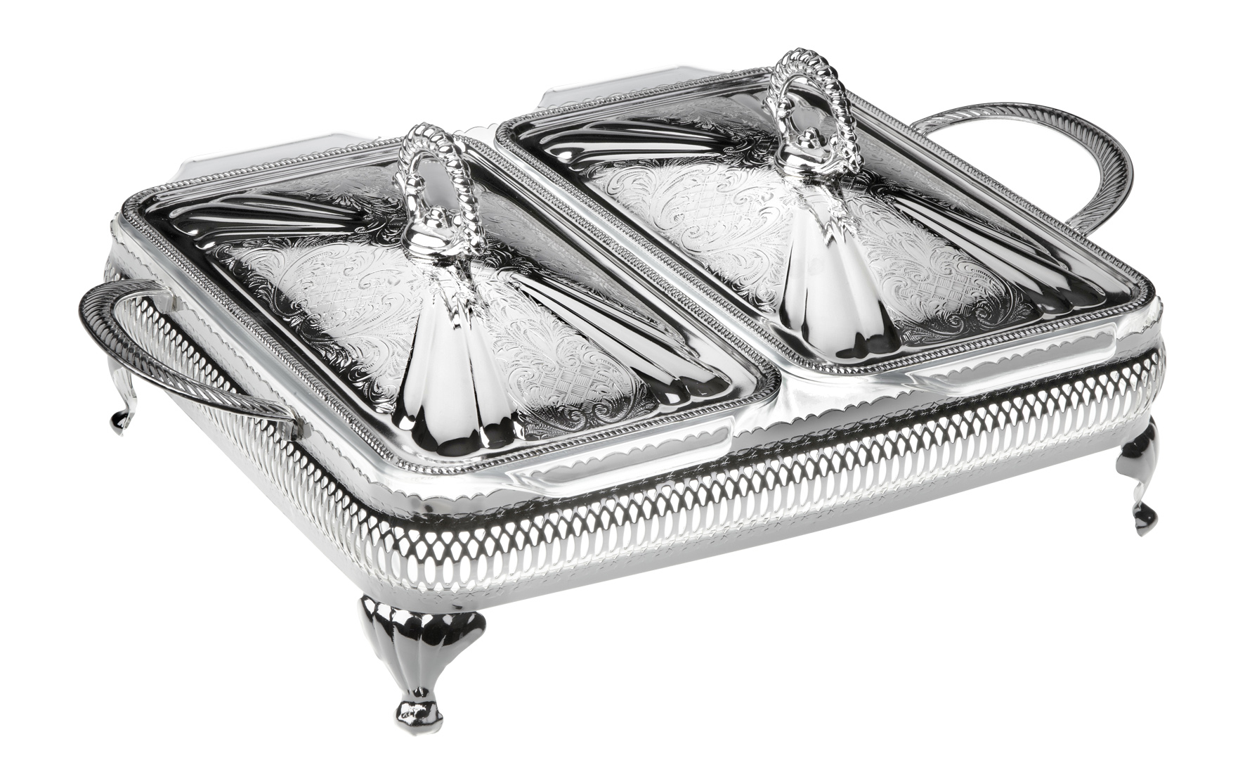 Silver Plated Gallery Frame with Handles and Legs. 2 Oblong “Oven to Tableware” Glass Casseroles, complete with Silver Plated Decorative Lids with Diecast Handles.