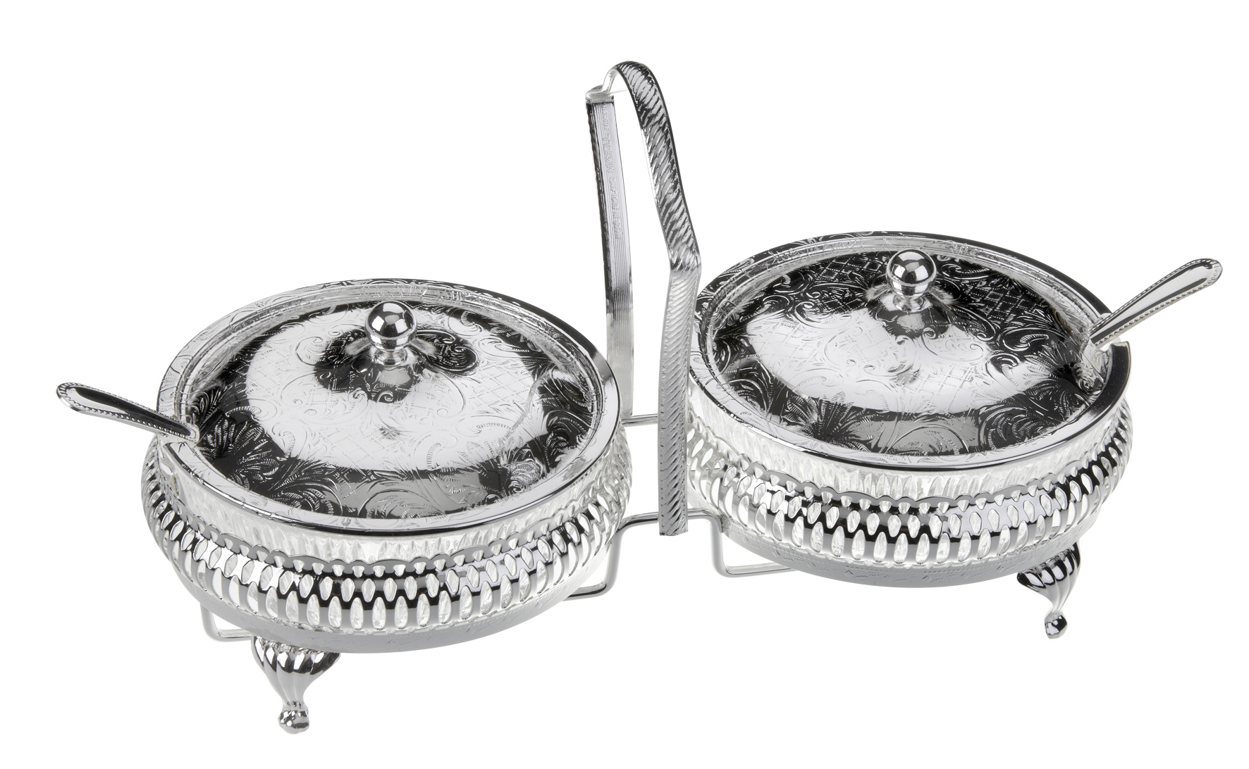 Silver Plated Gallery Frame with Legs, Handle and Patterned Lids, complete with 2 Glass Dishes and 2 Silver Plated Spoons.