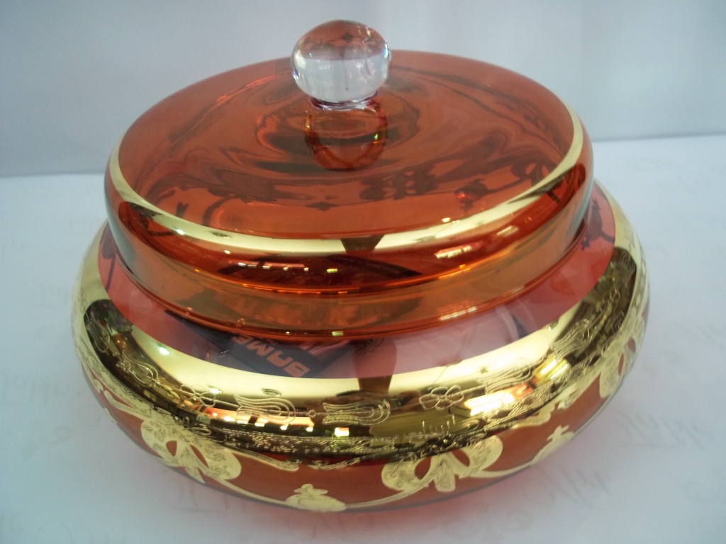 Large Bonbonniere with lid, Crystal, Color Red with Gold.