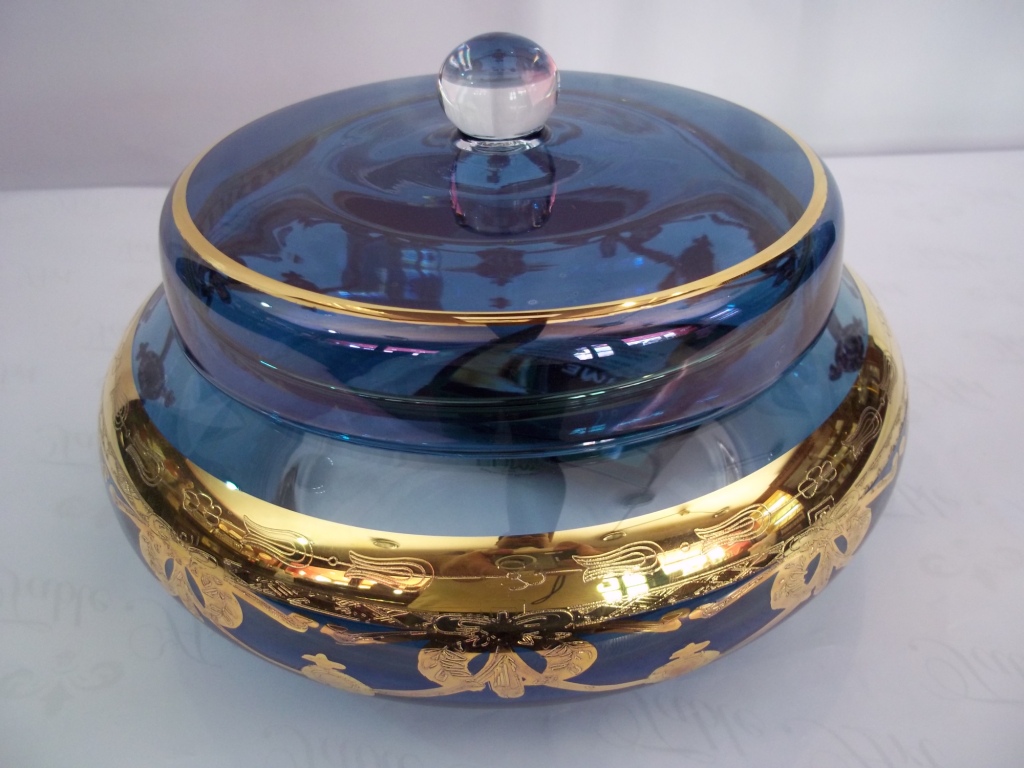 Large Bonbonniere with lid, Crystal, Color Blue with Gold.