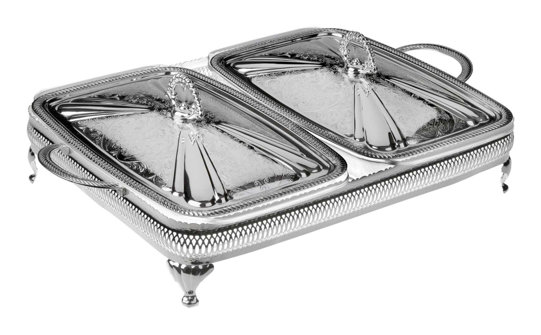Silver Plated Gallery Frame with Handles and Legs. 2 Oblong “Oven to Tableware” Glass Casseroles, complete with Silver Plated Decorative Lids with Diecast Handles