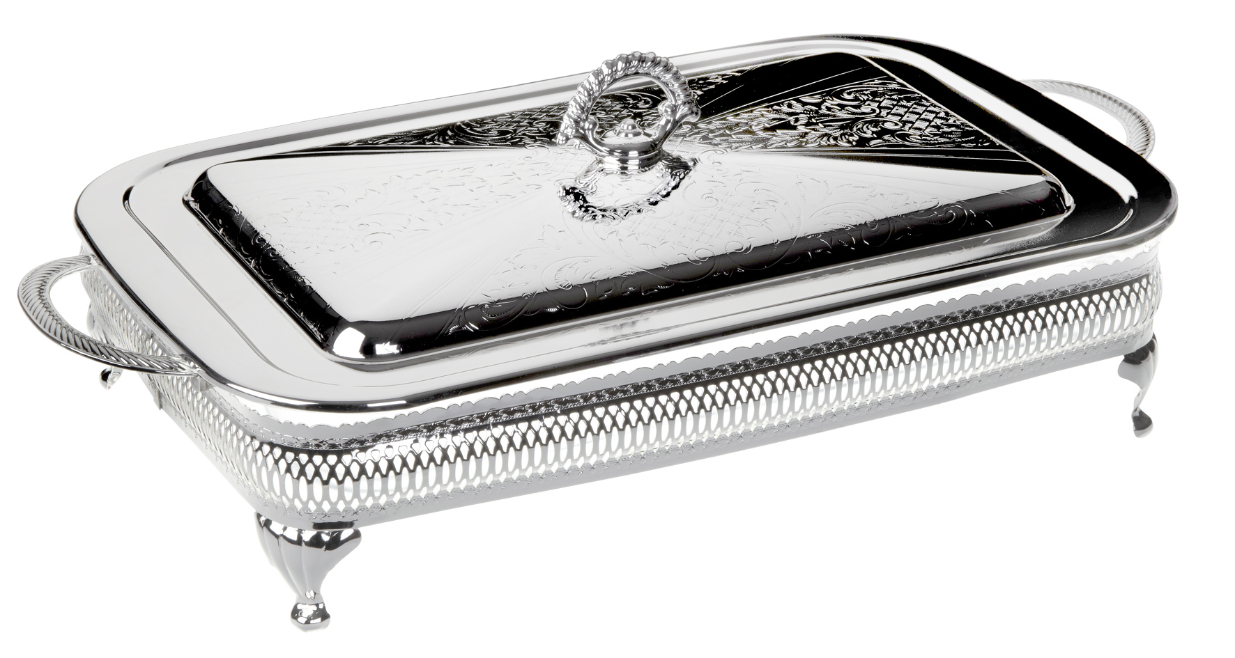 Silver Plated Gallery Frame with Handles and Legs. Large Oblong “Oven to Tableware” Glass Casserole, complete with Silver Plated Decorative Lid with Diecast Handle.