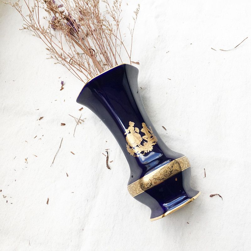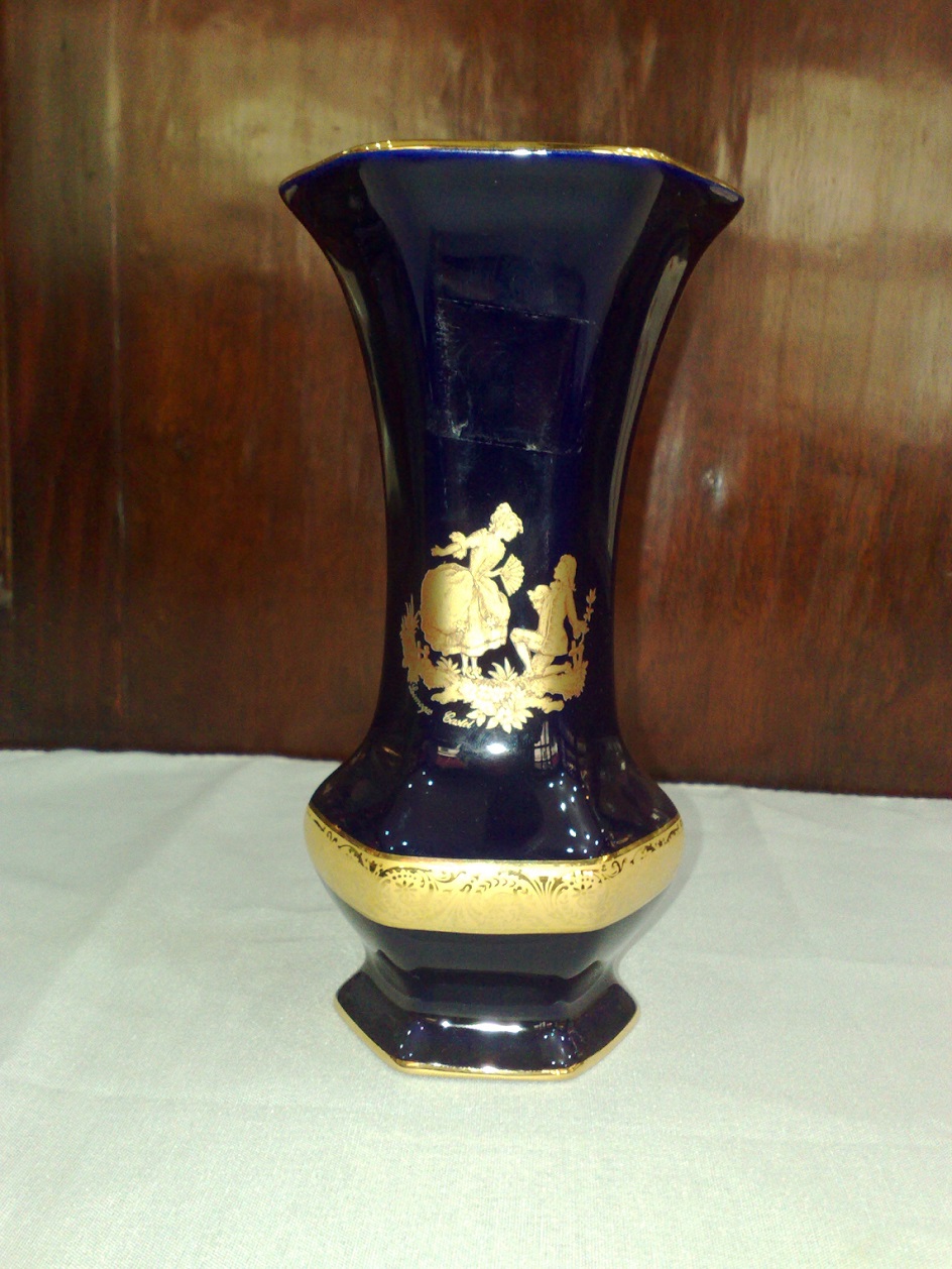 Limoges Vintage Blue Gold Romeo and Juliet Hexagonal Vase.