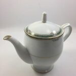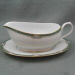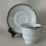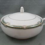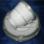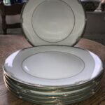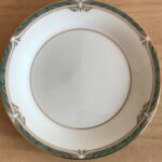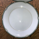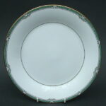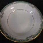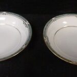 ELEGANT NORITAKE “GLENABBEY” P586 FINE BONE CHINA DINNER SET WHITE BACKGROUND DECORATED WITH GREEN AND SLIGHT HINT OF BLUE COMPLETE WITH GOLD RIMMED EDGES. MICROWAVE AND DISHWASHER SAFE.