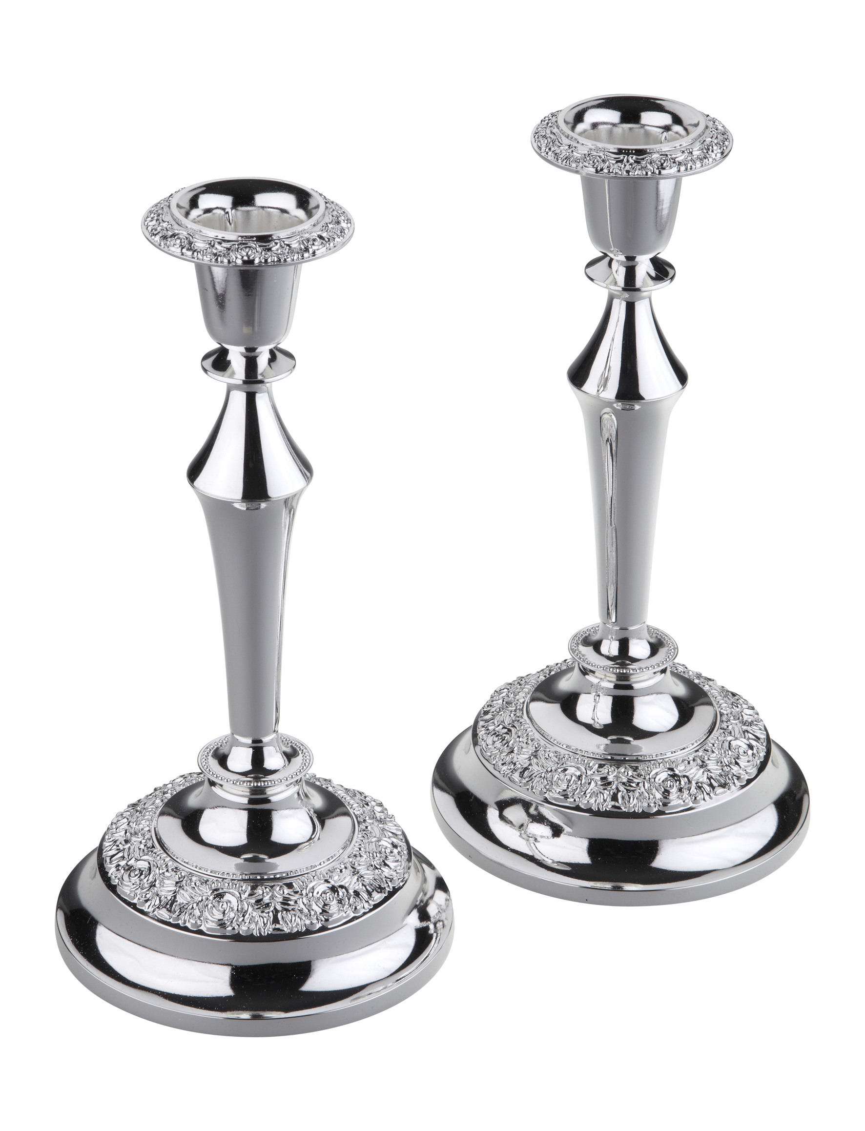 Silver Plated Pair of Tall Candlesticks, with “Rose Design” on Sconce and Base.