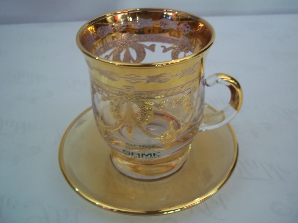Set of 6 Teacups – Crystal, Color Amber With Gold.