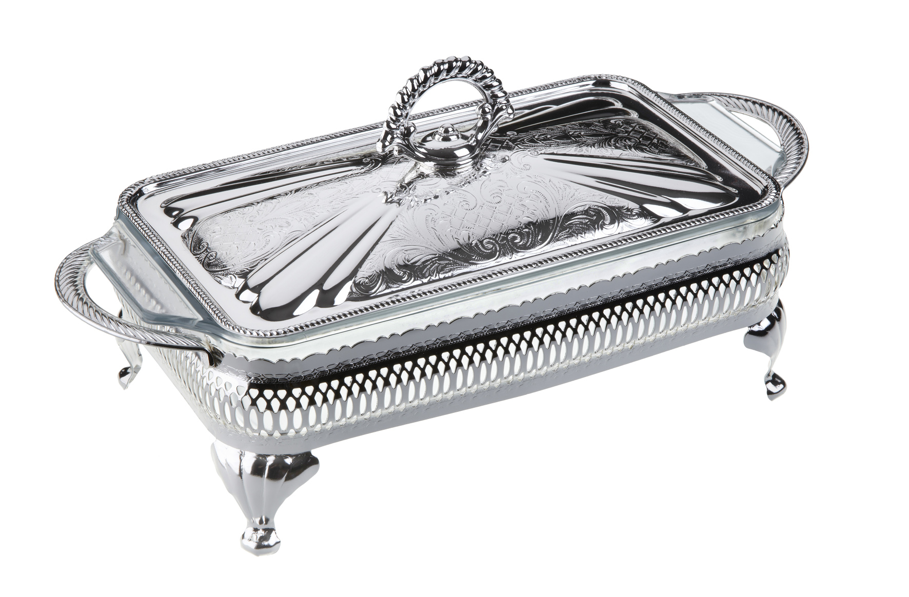 Silver Plated Gallery Frame with Handles and Legs. Small Oblong “Oven to Tableware” Glass Casserole, complete with Silver Plated Decorative Lid with Diecast Handle.