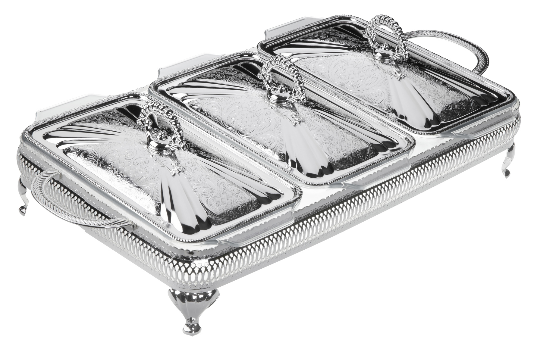 Silver Plated Gallery Frame with Handles and Legs. 3 Oblong “Oven to Tableware” Glass Casseroles, complete with Silver Plated Decorative Lids with Diecast Handles.